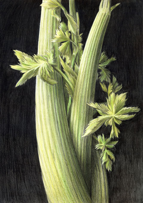 Unfolding presents celery stalks as architectural forms, evoking classical columns, where the stillness of the stalks contrasts with the dynamic movement of the leaves, revealing a dialogue between structure and vitality.